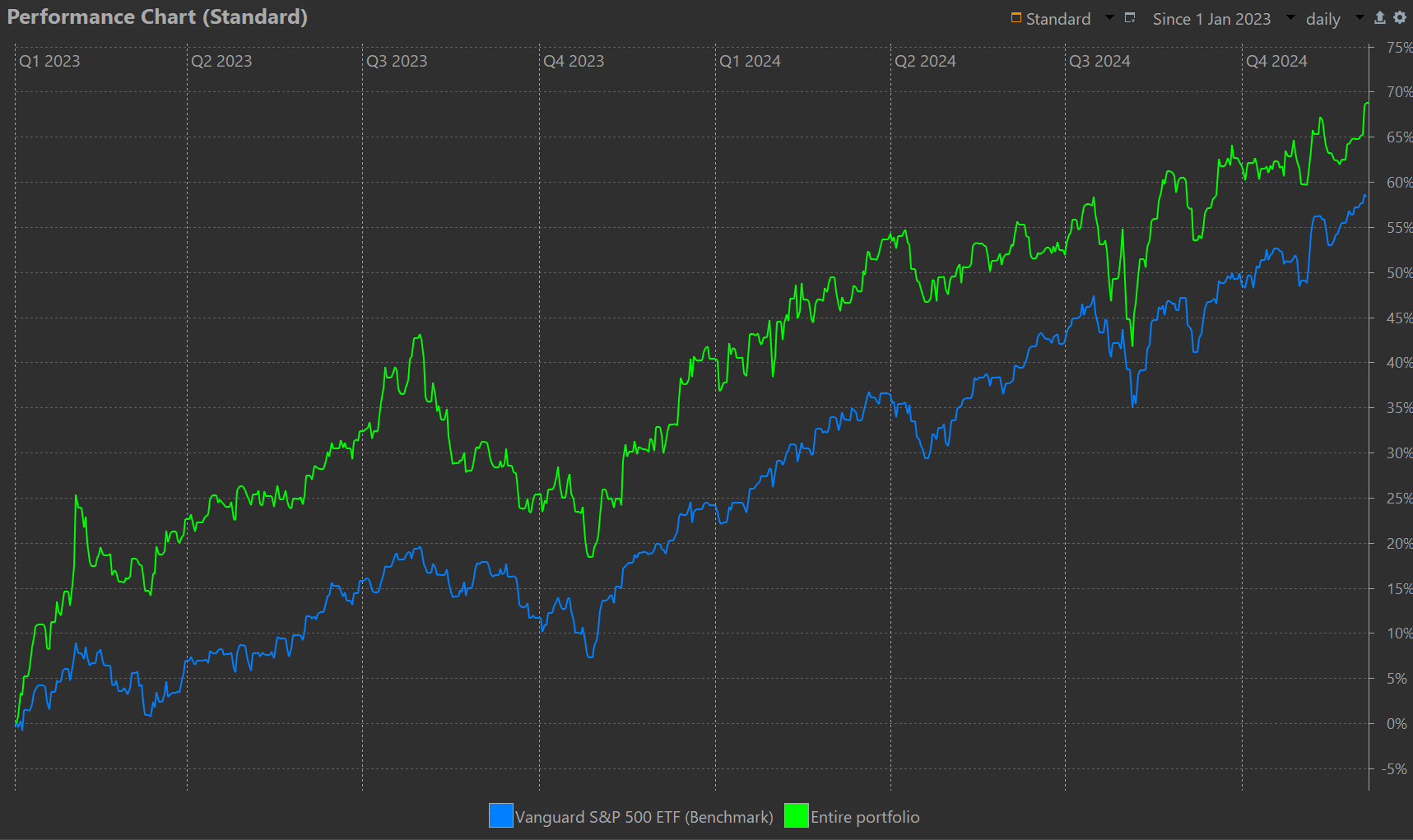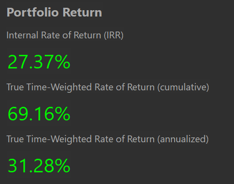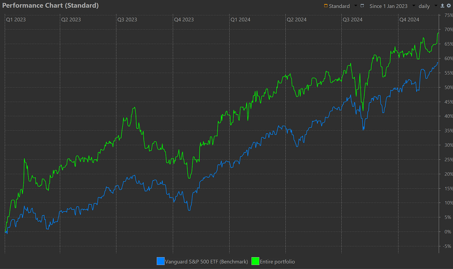 Over the past 2 weeks, our portfolio has seen a large gain. November’s performance maintained and closed at 2.1 %, with December starting very strong at a 2.4% gain. This brings our year-to-date return up to 20.2%.
