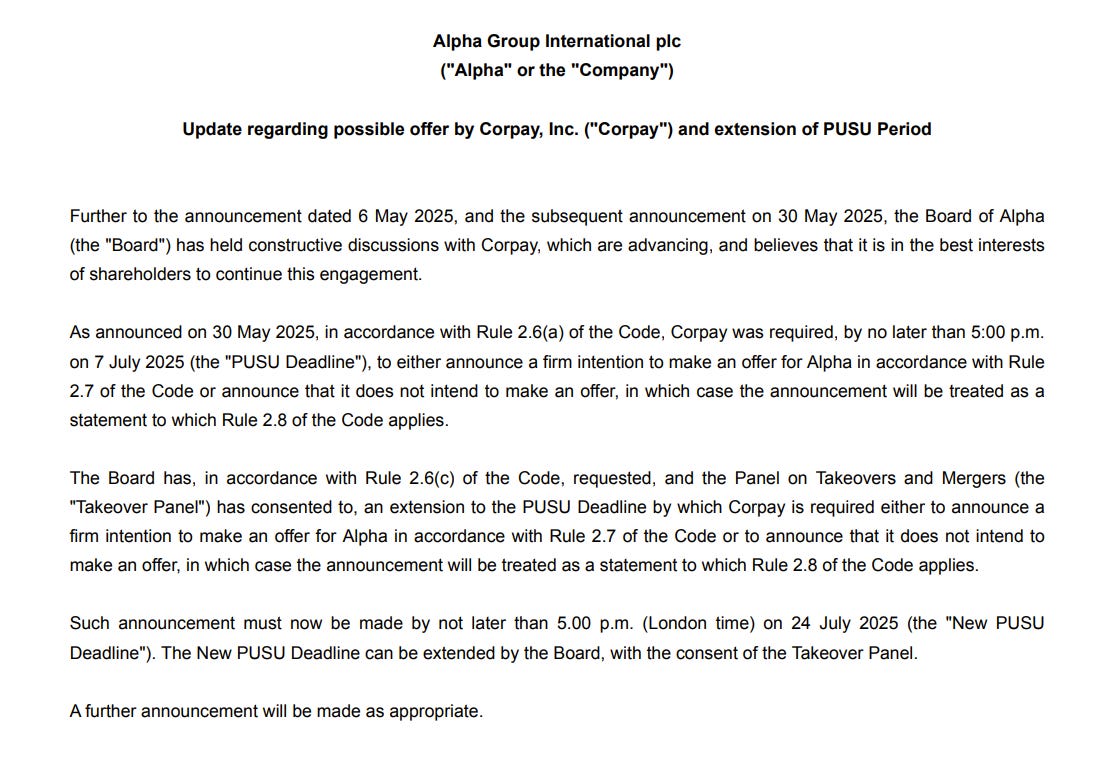Corpay remains in active discussions to acquire Alpha, though the timeline has shifted beyond initial market expectations.